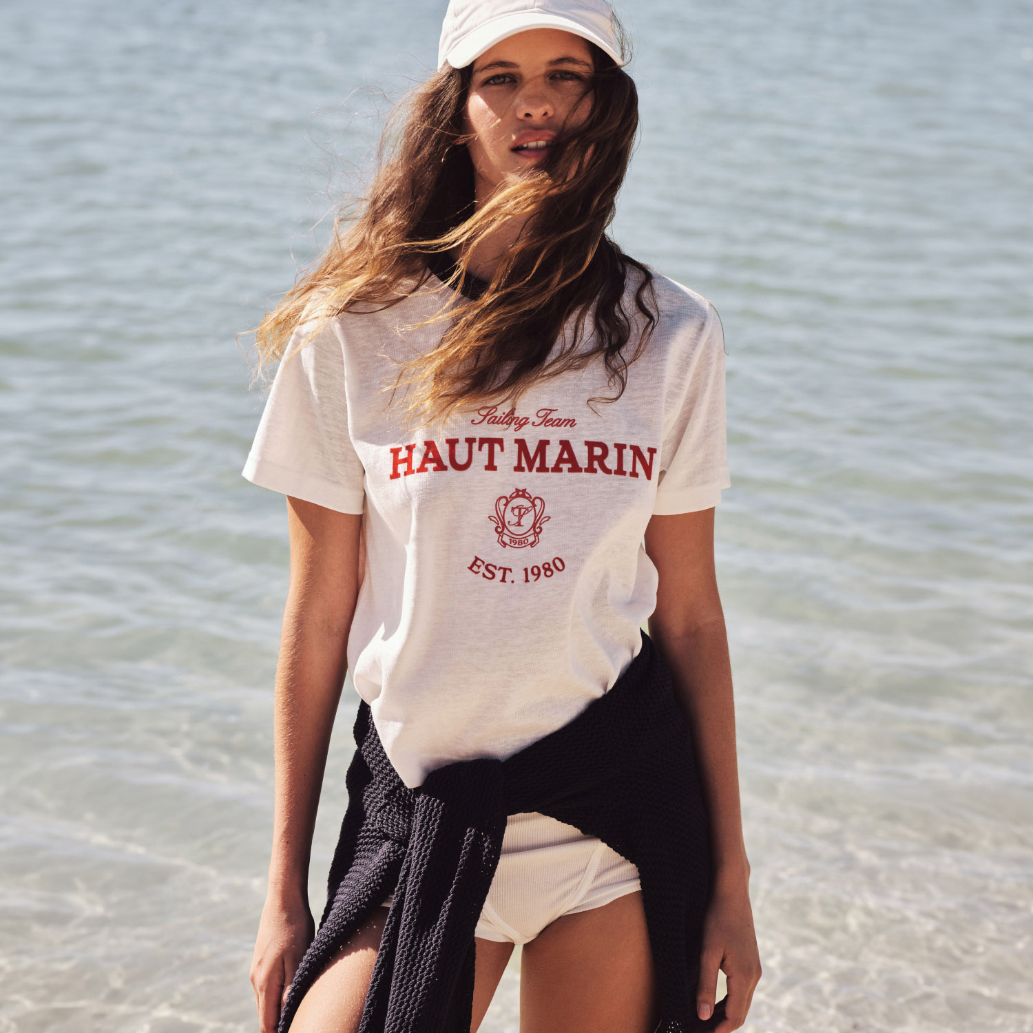Новинки женской коллекции отсылают к парусному спорту. Главный акцент сделан на модели в полоску. Сетчатый свитер поло, приталенный топ на тонких бретелях, хлопковый лонгслив с карманом — в бело-синей гамме. Майка с вырезом каре и прямые джинсы с высокой посадкой — в молочно-бирюзовой палитре. Толстовка из хлопкового футера — в пастельных розово-сиреневых оттенках.