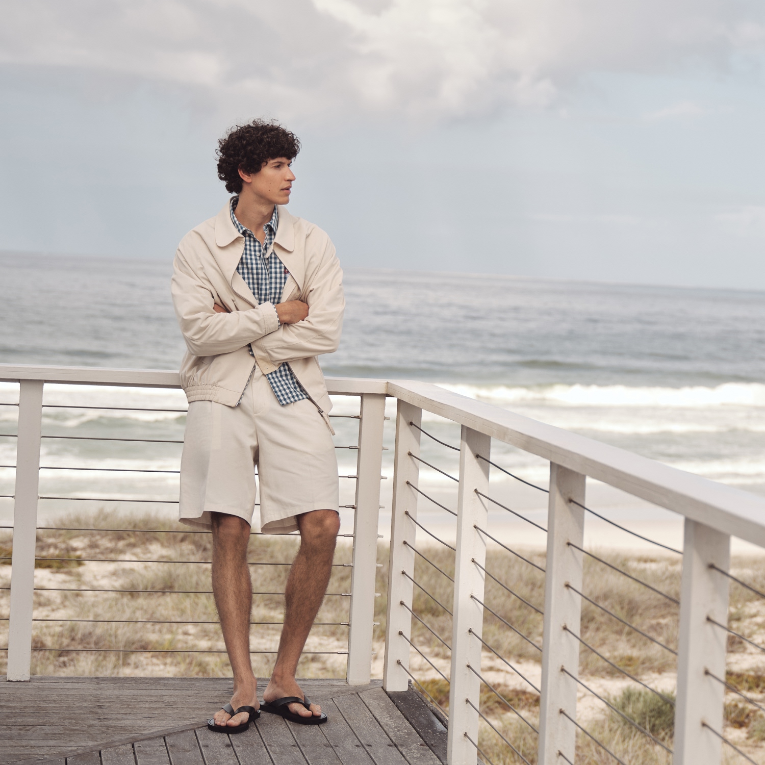 Среди новинок мужской линии — базовые майки и рубашки, джинсы разных силуэтов, удлиненные шорты, а также несколько изделий в полоску — хлопковый бомбер на молнии, сет в пижамном стиле, поло с контрастной отделкой. Особого внимания заслуживает красная ветровка объемного кроя. К новому сезону в коллекции обуви для мужчин появились кожаные вьетнамки и сандалии.