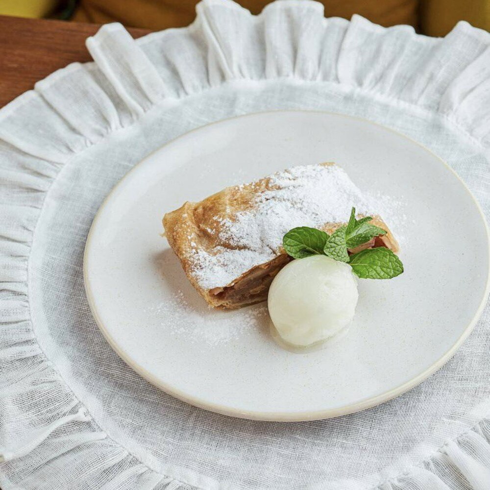 На десерт – яблочный штрудель с лимонным сорбетом и вишнёво-свекольный кекс с растительным «пломбиром» 🍒